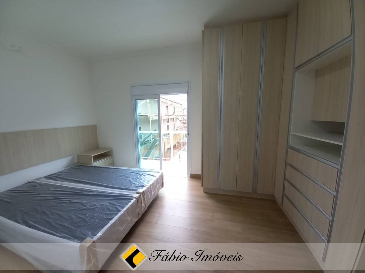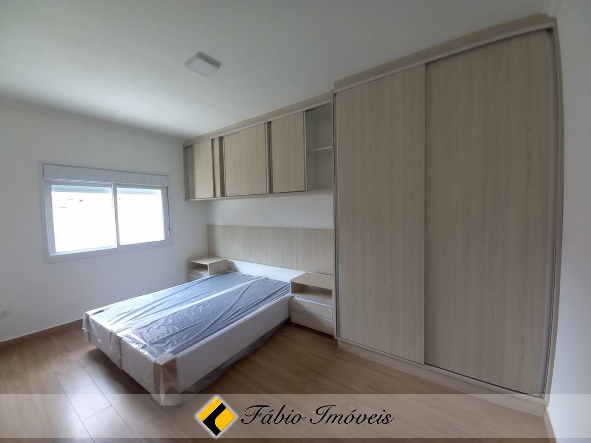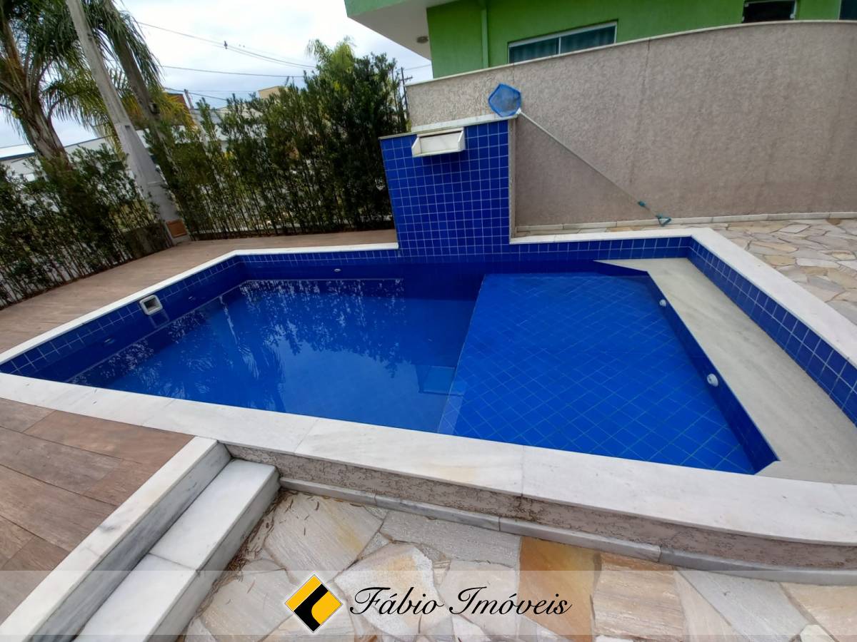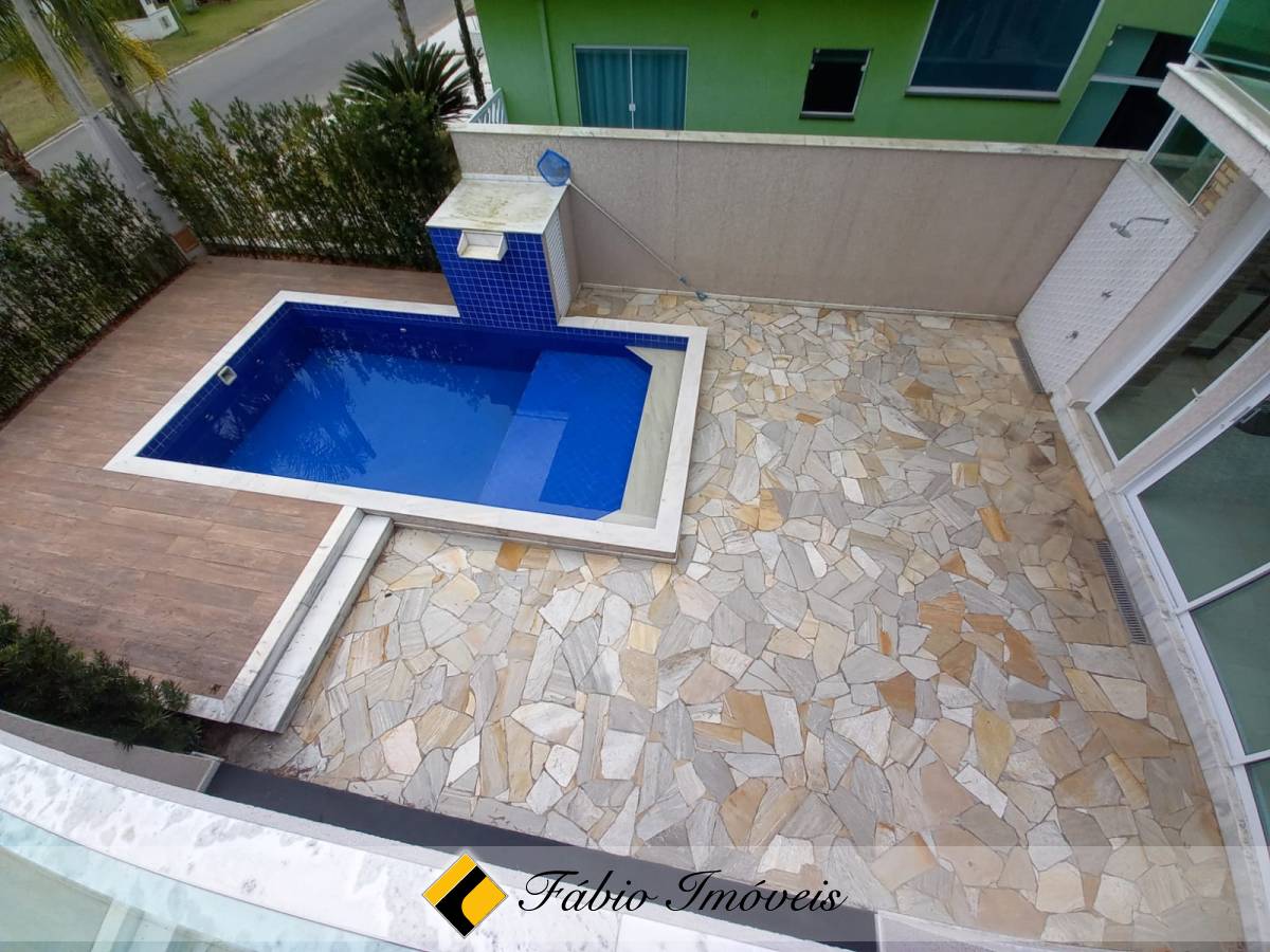 São quatro suítes, sendo uma no piso inferior e três no piso superior, todas com armários planejados e camas box, sala ampla para dois ambientes, cozinha com armários e balcão em granito, banheiro social, lavanderia, piscina, área gourmet com churrasqueira, esquadrias em alumínio e pisos em porcelanato.